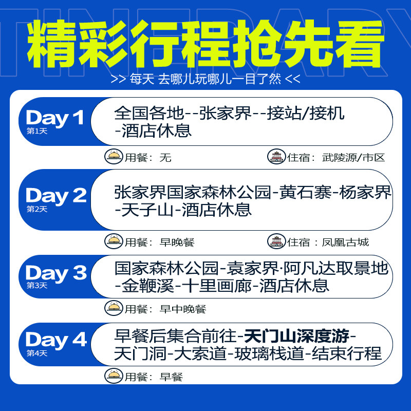 行程起点与终点均设在张家界市区,交通便利,适合飞抵长沙、武汉或重庆等地后高铁/航班中转抵达的差旅人士。若您因公前往华中地区,可顺势安排此4天3晚行程作为工作后的奖励假期。本地化接待、无缝衔接的行程设计,让中转停留不再枯燥,而是转化为一次难忘的山水之旅。