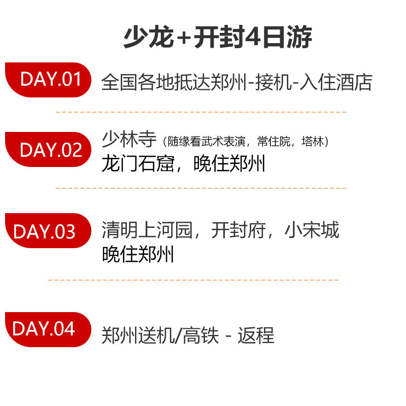 本行程专为商务差旅人士设计,从郑州出发,4天内高效覆盖洛阳、焦作、开封三大目的地,无缝衔接少林寺、龙门石窟、云台山、开封府等核心景点。全程交通接驳顺畅,住宿安排紧邻交通枢纽,节省通勤时间,兼顾工作与文化体验,是出差之余深度感受中原文明的理想选择。