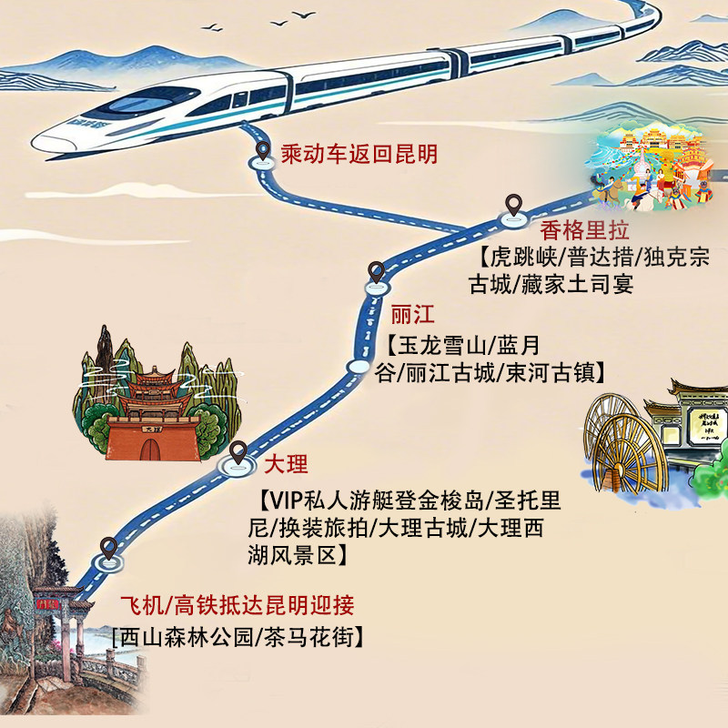 本行程以昆明为起点,无缝衔接大理、丽江、迪庆等云南核心旅游城市,特别适合商务人士在完成差旅任务后顺道开启深度度假。从春城出发,一路向西,既能高效完成工作安排,又能沉浸于苍山洱海、玉龙雪山与香格里拉的自然人文风光中,实现工作与休闲的完美平衡。全程交通衔接顺畅,节省转乘时间,让差旅后的放松之旅更加从容不迫。