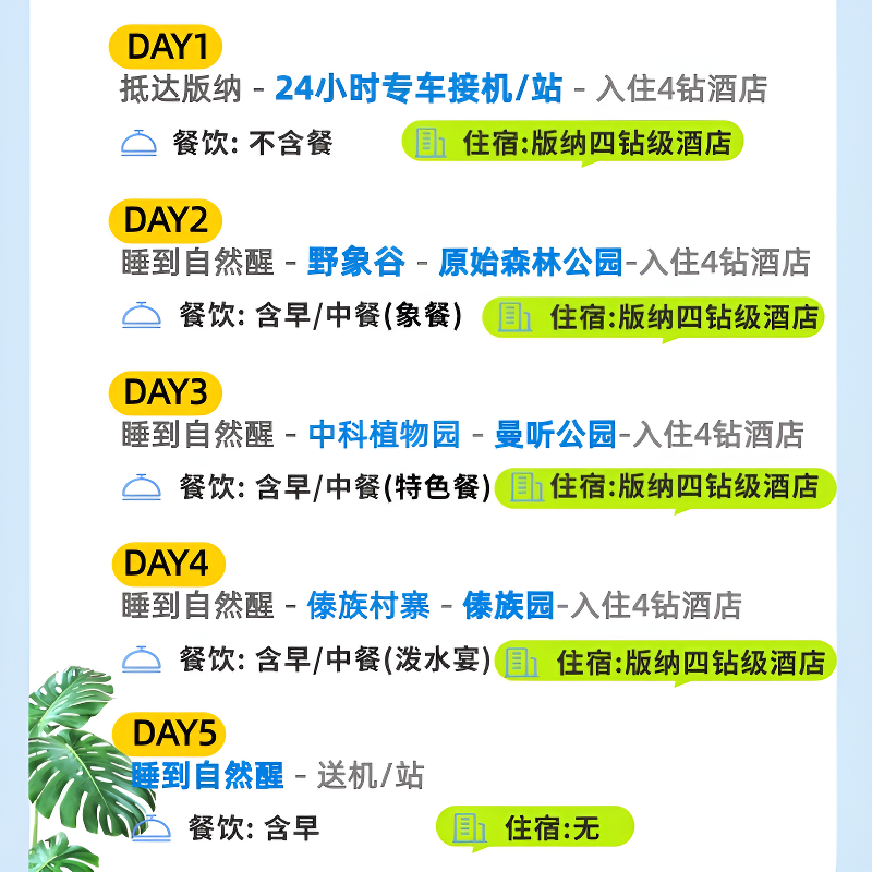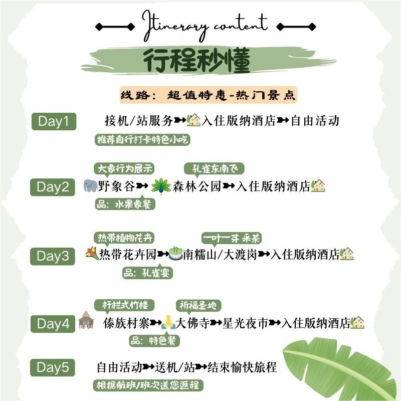 行程精心整合“丛林/雨林”“民族村”“植物园”“泼水节”等热门标签,打造高密度主题游体验。差旅人士无需自行规划路线,即可在5天内高效打卡西双版纳最具代表性的自然与人文地标。这种主题化设计节省信息搜集成本,让短暂假期发挥最大价值。