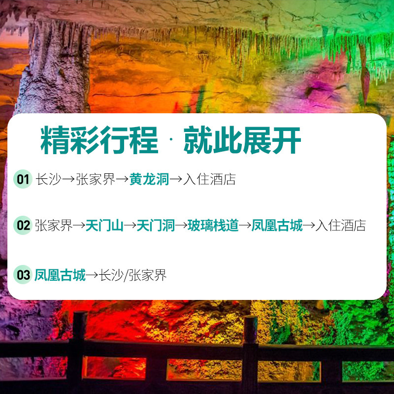 本产品以“自然+人文”双主题打造差旅新范式:黄龙洞探秘地下溶洞奇观,天门山挑战99道弯与玻璃栈道,凤凰古城夜游吊脚楼灯火。三天内实现地质奇观、极限体验与古镇慢生活的多元切换,满足差旅者对效率与深度的双重需求。