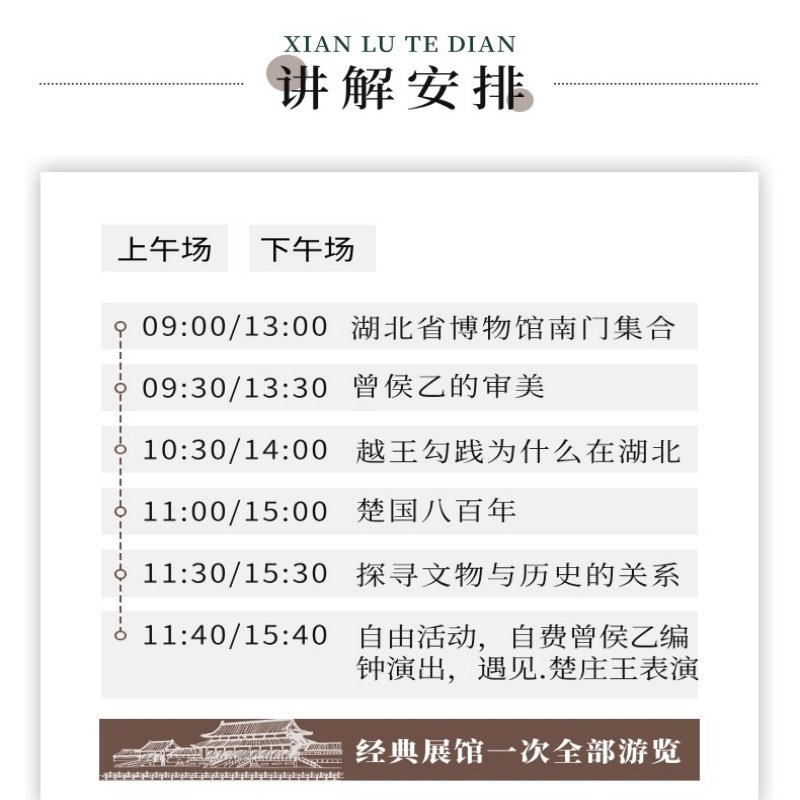 充分考虑差旅人士对时间的高度敏感,本产品严格控制行程节奏:2小时专业人工讲解聚焦核心展品,避免冗长拖沓;随后直接转场观看定时编钟表演,中间无冗余交通或等待。全程约4-5小时,适合安排在上午或下午半日空档,不影响晚间会议或次日航班,真正实现“高效差旅+深度文化”双赢。