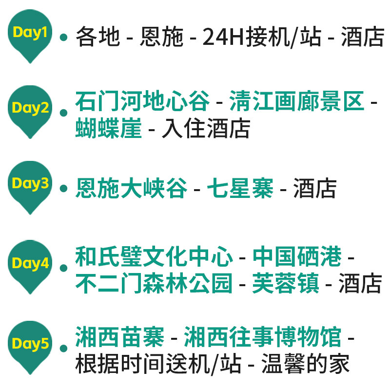 精心规划的5天4晚行程,科学串联恩施地心谷、清江画廊、芙蓉镇及湘西苗寨等精华景点,避免无效绕路。每日车程合理,景点衔接流畅,既保证深度游览,又节省宝贵时间。特别适合利用年假或会议间隙出行的商务人士,在有限时间内最大化旅行价值。