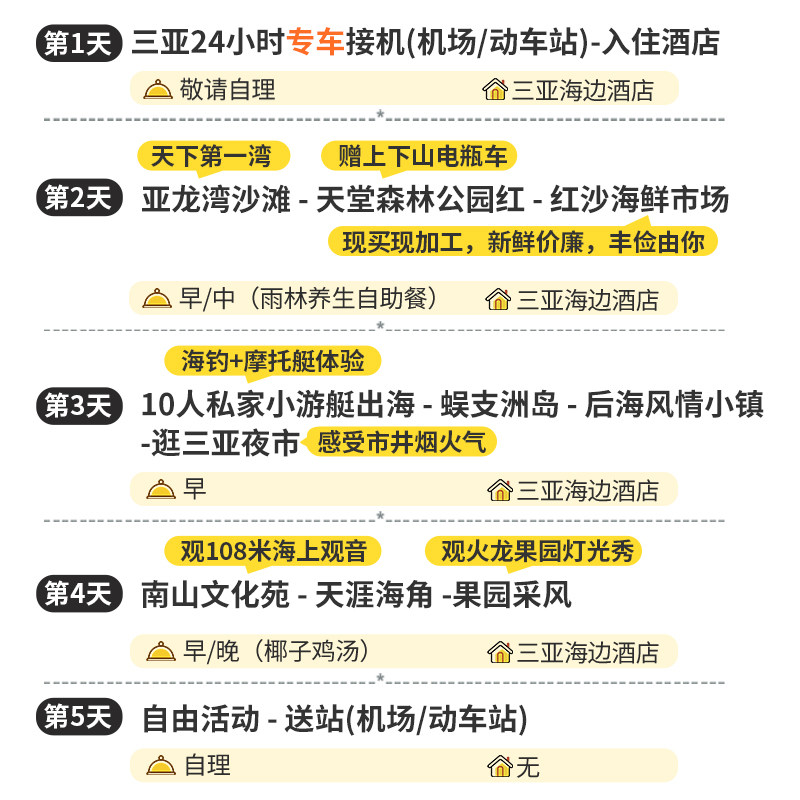 本行程支持1人单独预订,极大满足差旅人士临时出行或独自放松的需求。无需等待拼团,随时出发,兼顾高效与休闲。无论是结束紧张会议后的短暂休整,还是利用周末延长假期,都能无缝衔接工作与生活节奏,让三亚之旅成为您高效差旅中的理想调剂。