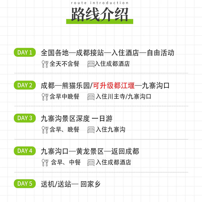 面向武汉、长沙、郑州等华中城市差旅群体,本线路提供高效进出川方案。行程聚焦四川核心IP——九寨沟的童话世界、都江堰的千年智慧、熊猫基地的生态趣味,完美契合“人文旅行”与“历史古建”标签。1人可订机制尤其适合独自出差者,轻松实现工作与度假的无缝转换。