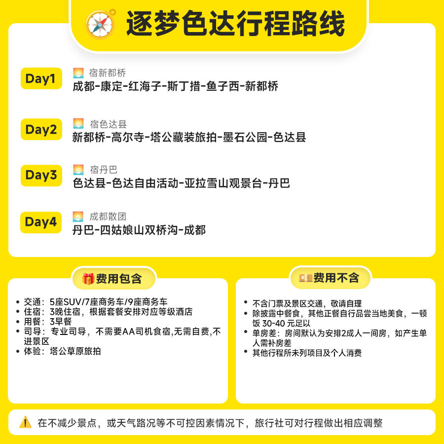 本线路支持1人单独报名参团,无需拼凑多人,极大提升了差旅人士的出行灵活性。对于因公务或临时安排需独自前往川西的旅客而言,省去了等待成团或协调同行者的麻烦,可随时根据工作节奏预订出发,高效利用碎片化假期,兼顾工作与休闲,实现说走就走的高原之旅。