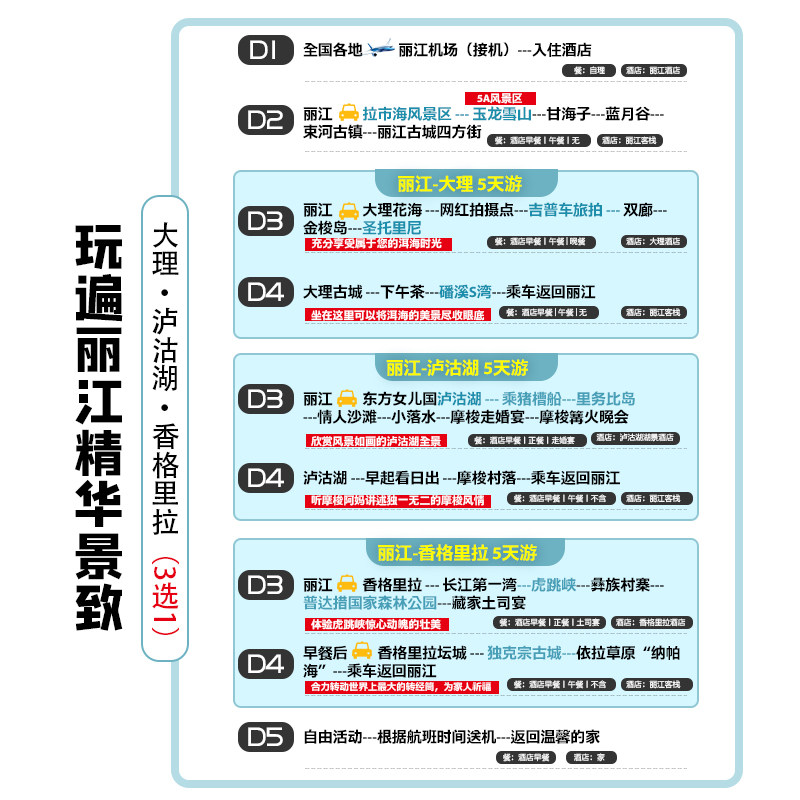 5天4晚全程跟团游包含丽江起止交通接驳、景区间专车转运及门票代订,差旅人士无需操心路线规划、购票排队等琐事。尤其适合初次到访云南的商务客,将宝贵时间聚焦于核心事务,真正实现‘落地即高效’的差旅体验。