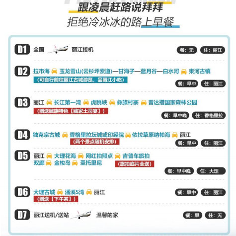 本行程专为来自上海、北京、广州、深圳等一线城市的差旅人士设计,提供便捷的交通衔接方案。无论您刚结束一场紧张的会议,还是需要短暂逃离都市节奏,均可从这些核心城市直飞丽江或大理,快速开启七天六晚的纯玩之旅。行程安排充分考虑差旅人群的时间效率,避免冗余环节,让您在有限假期中最大化享受云南的自然与人文之美。