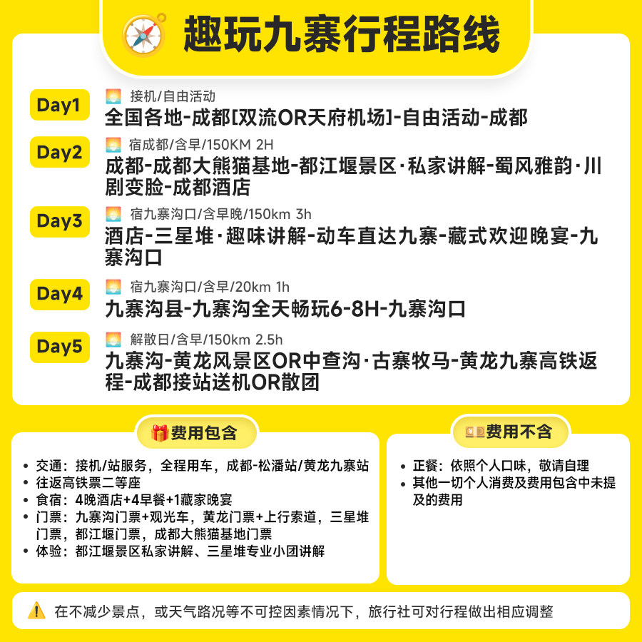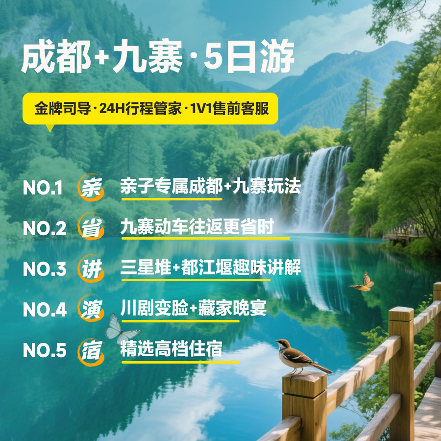 本产品巧妙整合出发地成都及目的地阿坝(九寨沟)、德阳(三星堆)三大区域资源,5天内高效覆盖自然奇观、历史遗迹与现代都市体验。行程设计充分考虑差旅人士时间宝贵的特点,采用点对点直达交通,减少无效转乘,确保每日核心游览时间充足。无论是商务出差顺带家庭出游,还是专程亲子度假,都能在有限时间内收获最大化的旅行价值。