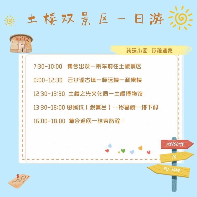 本产品以‘土楼+古镇’为核心主题,路线经过精心优化,避免无效绕行,确保在一天内高效覆盖两大核心景点。对于时间宝贵的差旅人群,这种主题明确、动线合理的行程设计,能最大化利用碎片化假期。上午探秘土楼建筑奇观,下午沉浸古镇慢生活,节奏张弛有度,既满足探索欲,又不致过度疲劳。