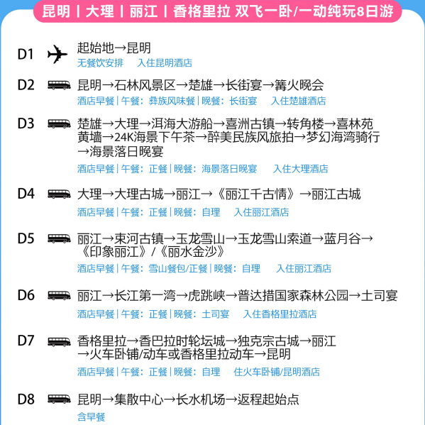 承诺全程无强制购物、无隐形消费,所有时间专注于景点游览与文化体验。对于时间宝贵的差旅人群,每一分钟都弥足珍贵。我们剔除冗余环节,确保您在8日内高效覆盖昆明、大理、丽江、香格里拉四大目的地,真正实现“所见即所值”,让假期投入产出比最大化。