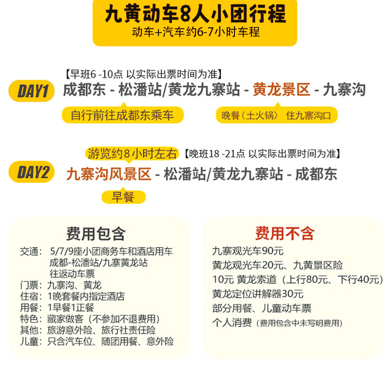区别于传统大团游,本线路采用2-8人高铁小团模式,人数精简确保服务更专注、行程更自由。差旅人士可在有限时间内深度体验九寨沟与黄龙的绝美山水,避免拥挤嘈杂,享受安静私密的度假氛围,真正实现“工作之余,说走就走”的高品质短途旅行。