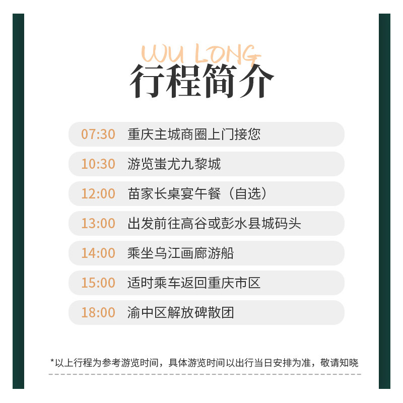 专为差旅人士设计的一日游行程,从重庆主城出发并返回,全程仅需一天时间,完美契合商务会议或工作间隙的短时度假需求。无需额外请假或调整住宿安排,早上出发、傍晚归来,既能沉浸于乌江画廊的山水之美,又不影响次日工作节奏,实现‘工作+休闲’无缝衔接。