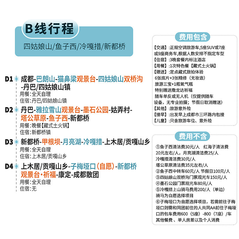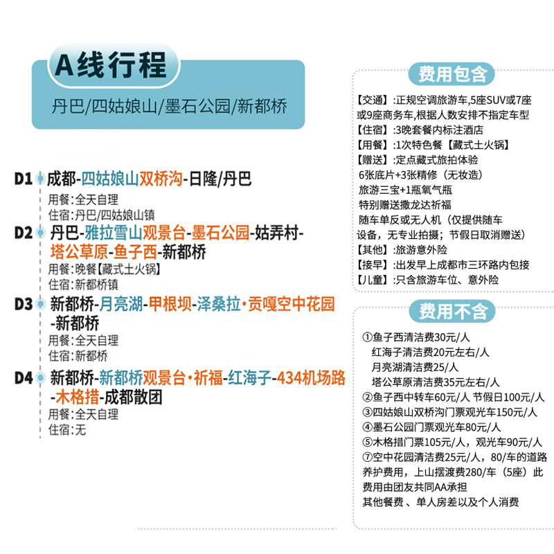 本线路支持1人单独预订,无需拼团等待,极大提升了商务人士或独自出差者的出行效率。从成都出发,覆盖甘孜、阿坝等川西核心目的地,行程安排紧凑合理,兼顾工作与休闲需求。无论是临时差旅调整还是个人假期延伸,都能快速响应,省去协调多人时间的麻烦,让差旅与度假无缝衔接。