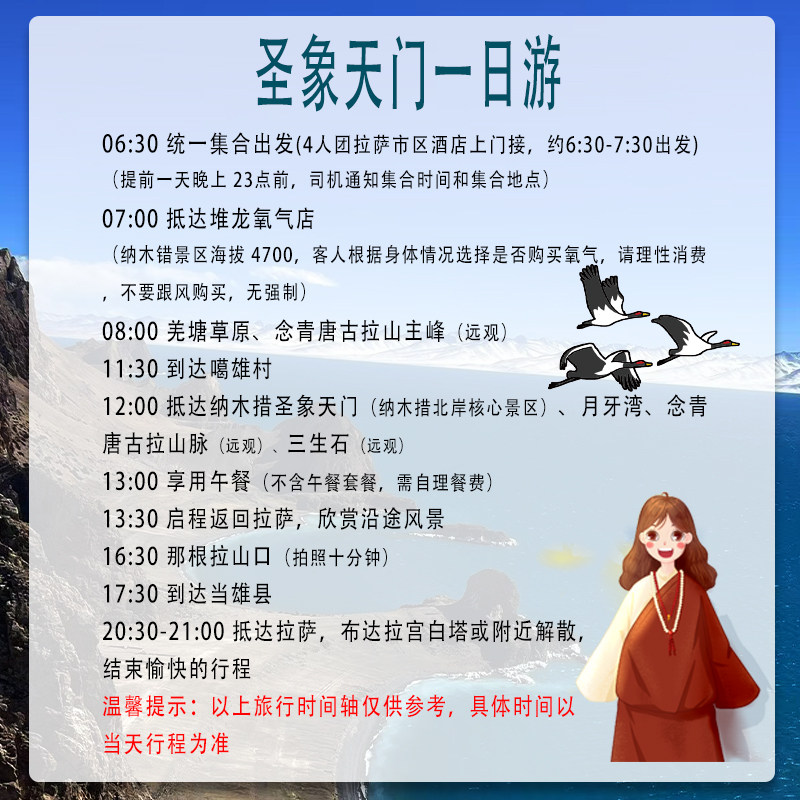针对商务或独自差旅人士设计,本线路支持1人单独预订,无需拼团等待,极大提升行程安排的灵活性与效率。无论您是临时出差至拉萨,还是希望在工作间隙快速体验高原风光,只需一天时间即可完成圣象天门精华游,节省宝贵时间,兼顾工作与休闲需求。