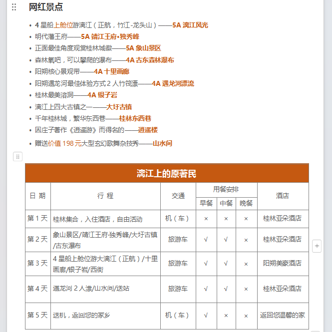行程包含桂林特色啤酒鱼及地道中国料理,满足差旅途中对美食的期待。阳朔西街夜市、本地农家菜馆等安排,让您在短暂假期中深度感受‘舌尖上的广西’,用味觉记忆为高强度工作注入愉悦感,提升整体出行满意度。