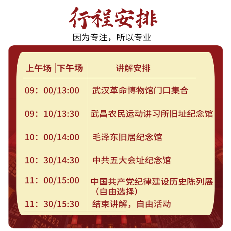 充分考虑差旅个体化、临时性强的特点,支持单人即时预订,无需等待成团。所有集合点均设于武汉核心城区,靠近主要商务区与交通枢纽,减少往返耗时。行程设计剔除冗余环节,直击精华展陈与旧址,确保每一分时间都用于有价值的文化吸收。是高效、便捷、有深度的差旅文化解决方案。