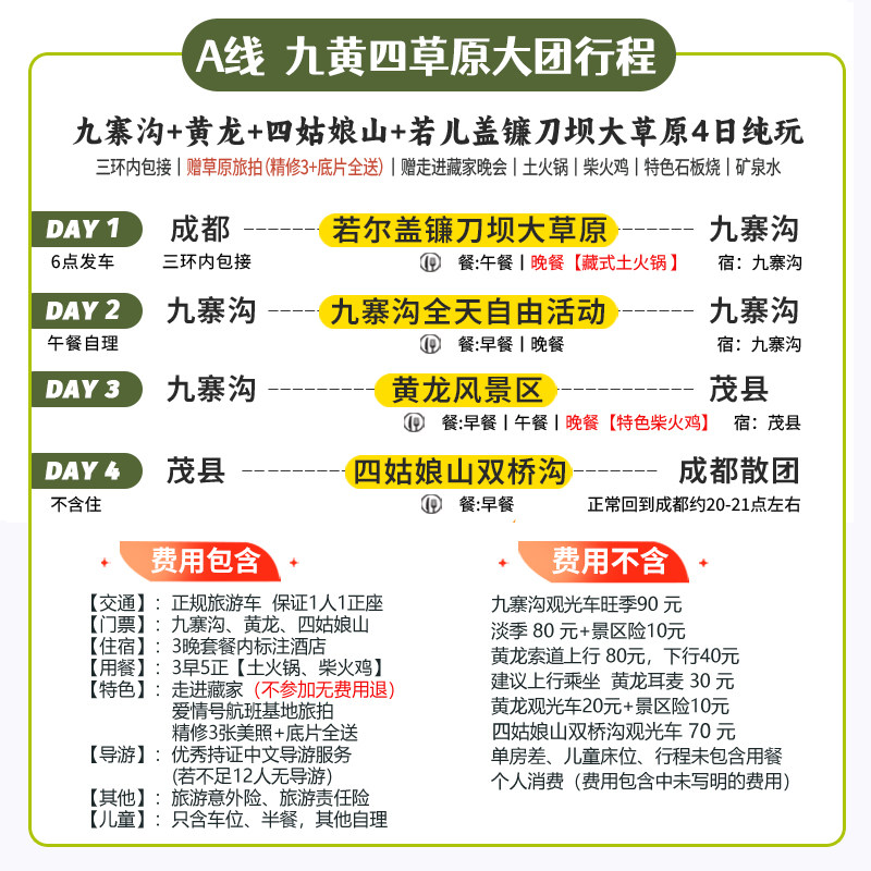 本线路专为差旅人士设计,从成都便捷出发,4日3晚紧凑行程高效覆盖九寨沟、黄龙、都江堰及四姑娘山草原等川西核心景区。无需辗转换乘,全程专业导游陪同,节省宝贵时间,兼顾工作与休闲。无论是结束商务会议后的放松之旅,还是利用周末短假深度体验自然奇观,都能在有限时间内收获最大化的旅行价值,真正实现差旅融合、高效度假。