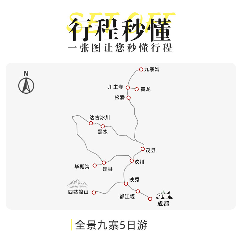 行程巧妙整合九寨沟、黄龙、达古冰川与毕棚沟四大世界级自然景观,5天4晚紧凑而充实,特别适合利用周末加年假完成一次高性价比的差旅延伸度假。从成都出发,环线设计减少重复路线,最大化利用有限假期,让出差途中也能沉浸于彩林、雪山、冰川与藏地文化的多重体验中。