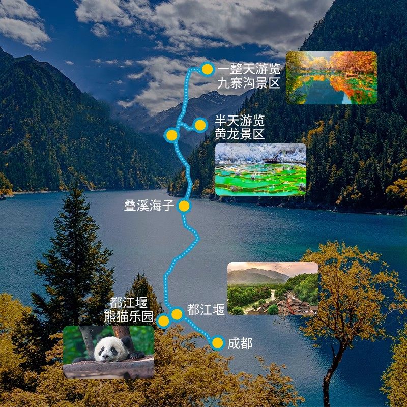 本线路支持单人预订,无需拼团等待,特别适合商务人士或独自出差后顺道度假的旅客。无论您是临时决定延长假期,还是希望在完成工作任务后快速切换至休闲模式,都能即刻启程,享受从成都出发前往九寨沟、黄龙、都江堰、峨眉山及乐山的6天5晚半自由行体验,兼顾效率与放松。