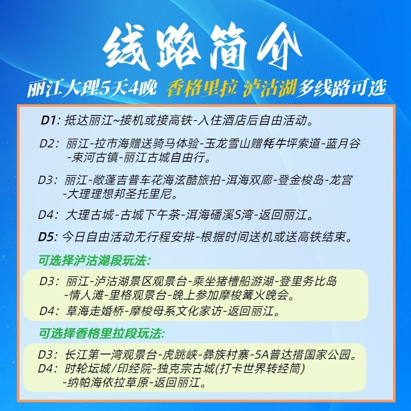 针对差旅时间紧张的特点,产品提供‘丽江进、大理出’或‘昆明双动’等多种交通组合。可选择飞机直飞丽江,结束行程后从大理乘高铁返昆,避免重复路线,节省至少6小时车程。尤其适合仅5天假期的上班族,高效串联玉龙雪山、洱海、香格里拉等核心景点,最大化利用每一分钟。