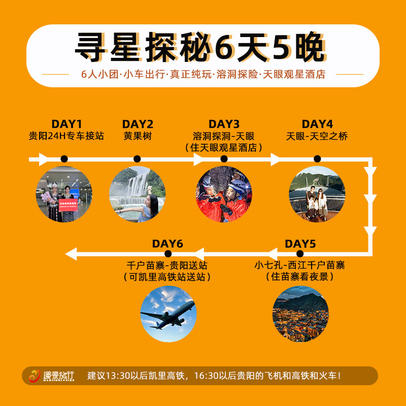 本行程支持1人单独报名参团,无需拼凑人数,极大提升差旅人士的出行灵活性。无论您是商务出差间隙想短暂放松,还是独自探索贵州秘境,都能即刻启程。6天5晚的行程紧凑而不仓促,涵盖黄果树瀑布、小七孔、西江千户苗寨、中国天眼及神秘溶洞等核心景点,满足高效利用假期与深度体验的双重需求,是差旅人士兼顾工作与休闲的理想选择。