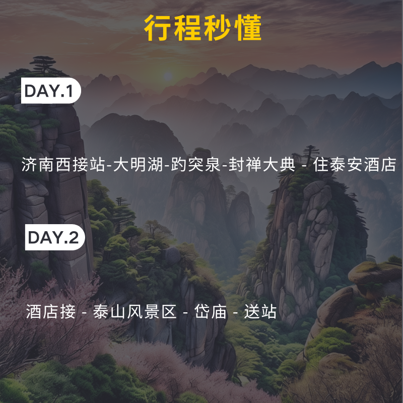 专为时间紧张的差旅人群设计,2天1晚的行程安排科学合理:首日下午抵达济南,游览趵突泉、宽厚里古街;当晚入住泰山脚下酒店,次日凌晨登山观日出,下山后参观岱庙,午后返程。全程节奏张弛有度,既满足登高祈福的心愿,又不耽误返岗工作,真正实现“出差+度假”无缝衔接。