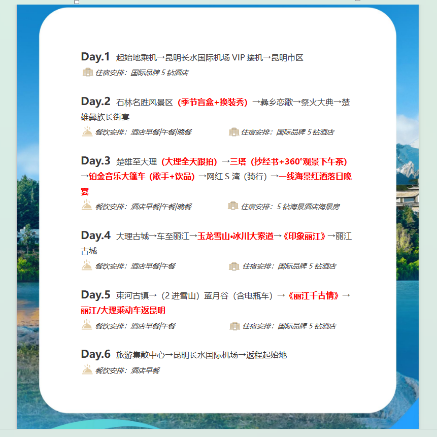 全程入住5钻标准酒店,为差旅人士提供安静、舒适、设施完善的休憩环境。高品质床品、高速网络、独立办公区域等配置,满足您处理工作与放松身心的双重需求。无论是在昆明结束一天会议后,还是在丽江古城夜游归来,都能快速恢复精力,确保第二天高效投入工作或继续探索旅程。
