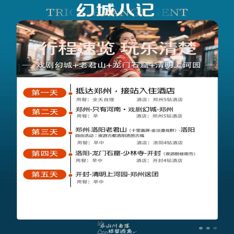 专为时间宝贵的差旅人群设计,5天4晚行程科学压缩交通耗时,聚焦核心体验:郑州戏剧幻城、洛阳龙门石窟与老君山、开封古城文化一网打尽。每日安排张弛有度,上午处理公务、下午文化参访,或反之,确保工作不耽误、旅行不走马观花。这种‘微度假’模式正成为新时代差旅人士的理想选择。
