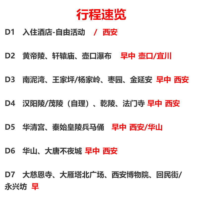 本行程专为商务与休闲兼顾的差旅人士设计,7天6晚高效串联西安、渭南、延安三地核心景点——从世界奇迹兵马俑、险峻华山,到革命圣地延安、气势磅礴的壶口瀑布,再到千年古刹法门寺与夜色璀璨的大唐不夜城。全程交通、住宿、门票无缝衔接,节省您自行规划的时间成本,让出差之余也能深度体验中华文明的厚重与壮美。