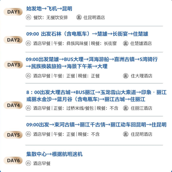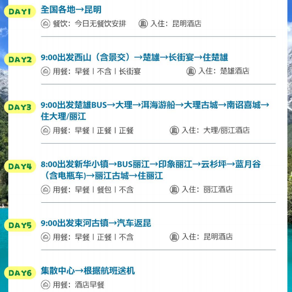 本行程专为差旅人士设计,支持1人独立成团,无需拼团等待,极大提升出行效率。无论是临时出差后的放松小憩,还是会议间隙的短途休整,都能快速预订、即刻出发。行程覆盖昆明、大理、丽江三大云南核心城市,兼顾商务便利与休闲体验,让您在高效完成工作的同时,也能沉浸于彩云之南的自然与人文魅力之中,实现真正的“差旅+度假”无缝衔接。