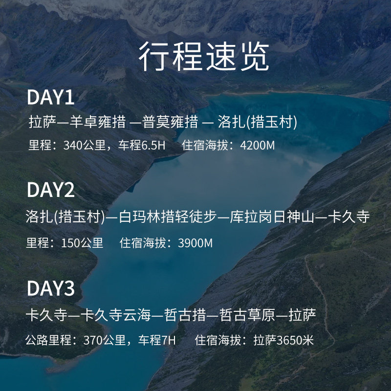 专为时间有限的差旅人群设计,3天2晚行程紧凑却不仓促,高效串联拉萨、山南两地精华——白马林措、普莫雍措、卡久寺等标志性目的地一网打尽。行程节奏张弛有度,既满足对藏地自然风光与宗教文化的深度探索,又避免过度疲劳,适合在商务活动间隙快速切换至度假模式,实现工作与身心放松的完美平衡。