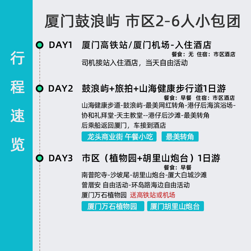 本行程专为差旅人士设计,采用2-6人精品小包团模式,既保障私密性又提升出行效率。无论是商务出差间隙的短途放松,还是携伴同行的轻度假,都能在紧凑三日中高效体验厦门精华景点。专属车辆接送、专业导游服务及灵活出发时间,让您无需操心交通与路线规划,轻松实现“工作+度假”无缝切换,是现代职场人理想的差旅延伸方案。