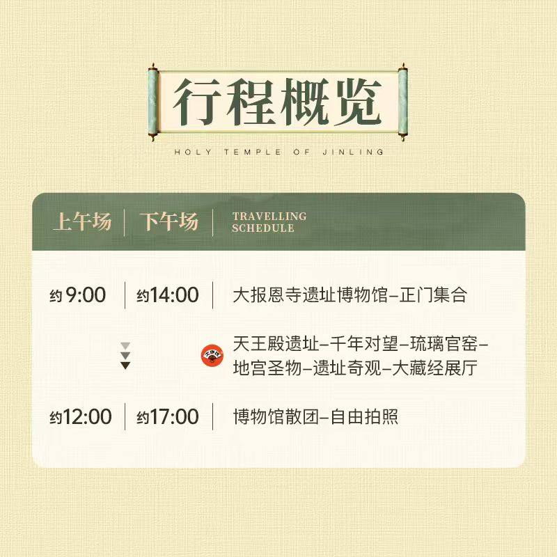 在快节奏的商务差旅中,本产品为您提供一处静谧的人文充电站。大报恩寺遗址不仅是全国重点文保单位,更是南京“世界文学之都”底蕴的重要见证。通过3小时专业导览,您将系统了解从东吴建寺到明代重建的完整历史脉络,感受中华文明的连续性与包容性。这种深度文化体验,远超普通观光,为差旅注入思想深度与精神滋养。