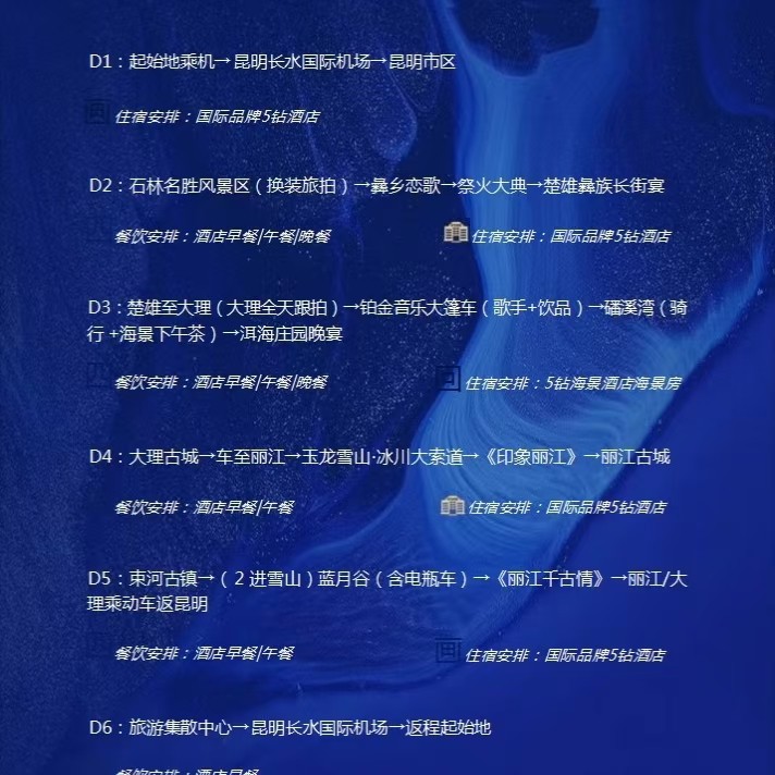 本行程支持单人预订,无需拼团等待,特别适合商务人士或独自出行的差旅用户。无论是临时调休、项目结束后的奖励旅行,还是独自放松身心,您都可以随时开启这场6天5晚的云南高奢纯玩之旅。全程入住5钻酒店,享受高品质住宿体验,兼顾差旅效率与度假舒适度,真正实现‘一人成行,说走就走’的自由差旅新方式。
