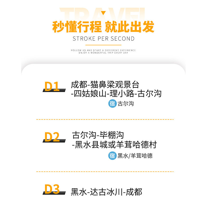 从成都市区出发,车程约3-4小时即可抵达阿坝核心景区,非常适合利用周末或短假期进行差旅延伸度假。无需额外请假,3日行程设计合理,首日出发、次日深度游览、第三日返程,最大化利用碎片化时间,实现工作与旅行的无缝衔接。