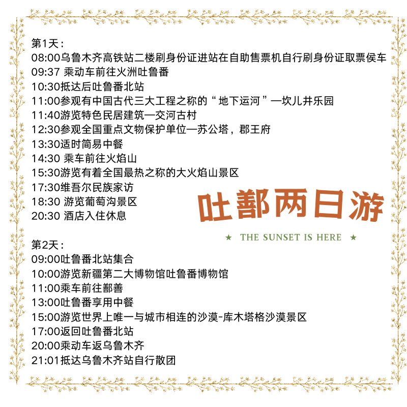精心设计的两天一夜行程,周五晚或周六早出发,周日傍晚返回乌鲁木齐,完美契合商务人士的周末空档。不占用工作日,却能完整体验吐鲁番自然与人文精华,是高效利用碎片化时间进行身心充电的理想选择。