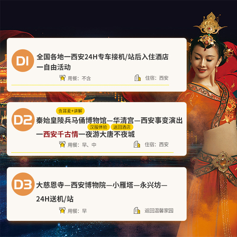 针对差旅人群对高效文化体验的需求,行程特别融入汉服换装与大唐不夜城夜游环节。白天参观历史遗迹,夜晚身着唐风华服漫步灯火璀璨的盛唐街区,沉浸式感受长安盛世气象。这种“日观古迹、夜入盛唐”的双重视角,让短暂差旅也能收获深度人文记忆,满足商务人士对精神放松与文化滋养的双重期待。