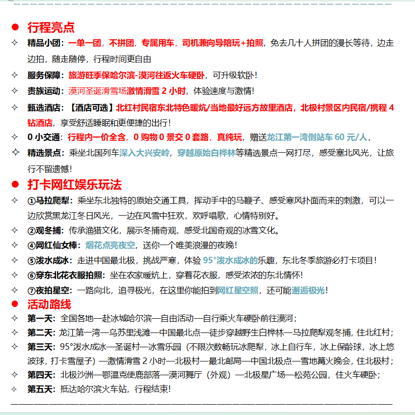 面向南京、苏州、杭州等长三角核心城市的差旅群体,本线路提供高效交通衔接与高品质服务。从江南水乡直抵中国最北端,体验截然不同的冰雪生态。行程中特别安排主题游环节,如穿东北花袄拍照、参与冰雪手工制作,兼具社交分享价值与文化沉浸感。四星酒店保障休息质量,确保差旅人在短暂假期中获得深度放松。