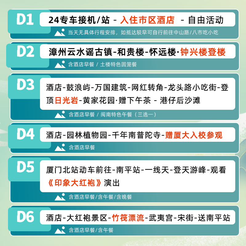本产品巧妙串联厦门、漳州、南平三大目的地,形成高效差旅动线。从厦门高崎机场或高铁站出发,无缝衔接漳州云水谣土楼与武夷山九曲溪,避免重复折返,节省宝贵时间。6天行程科学分配各区域游览时长,既涵盖海岛风情、古村古镇,又深入世界自然与文化双遗产地,让差旅人士在有限时间内高效打卡福建最具代表性的景观,实现工作与休闲的完美平衡。