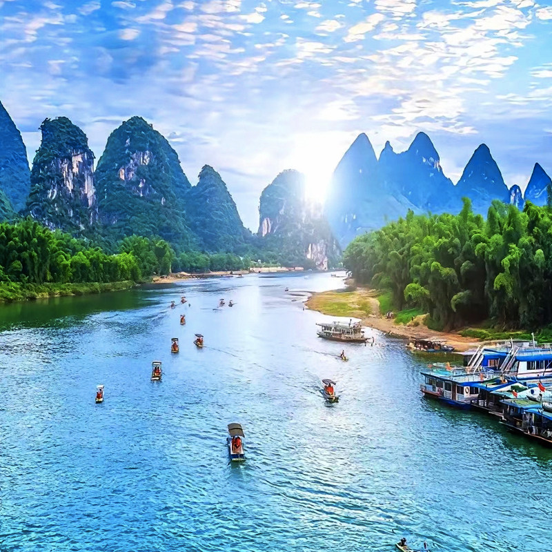 行程包含兴坪漓江段——正是第五套人民币20元背面取景地。差旅人士可在此拍摄经典同款照片,轻松完成社交平台打卡任务。这一标志性景观已成为桂林旅游的文化符号,高效满足“到此一游”的仪式感需求。