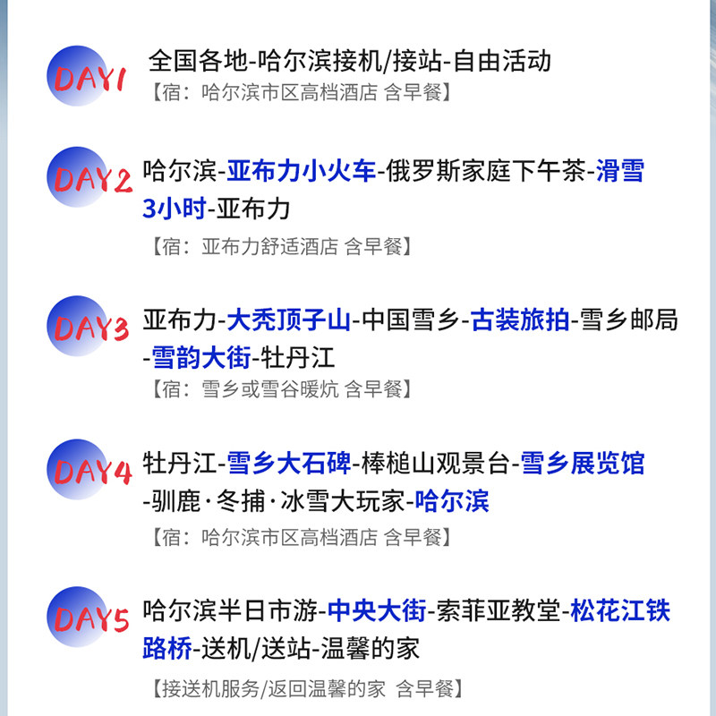 线路巧妙串联哈尔滨与牡丹江两大目的地,涵盖中央大街、圣索菲亚教堂、雪乡、镜泊湖等标志性景点。对于需要在两地处理公务的差旅人士,此行程可无缝衔接工作与游玩,避免重复往返的时间浪费。5日小团节奏张弛有度,白天游览,晚上可处理邮件或视频会议,真正实现‘工作度假两不误’的高效差旅模式。