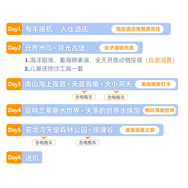 行程覆盖三亚市区及陵水县两大核心区域,既能满足在三亚参加商务会议、客户拜访等差旅需求,又能无缝切换至陵水分界洲岛享受亲子时光或情侣浪漫假期。两地车程仅约1小时,交通便利,让商务与度假高效融合,不浪费宝贵时间。