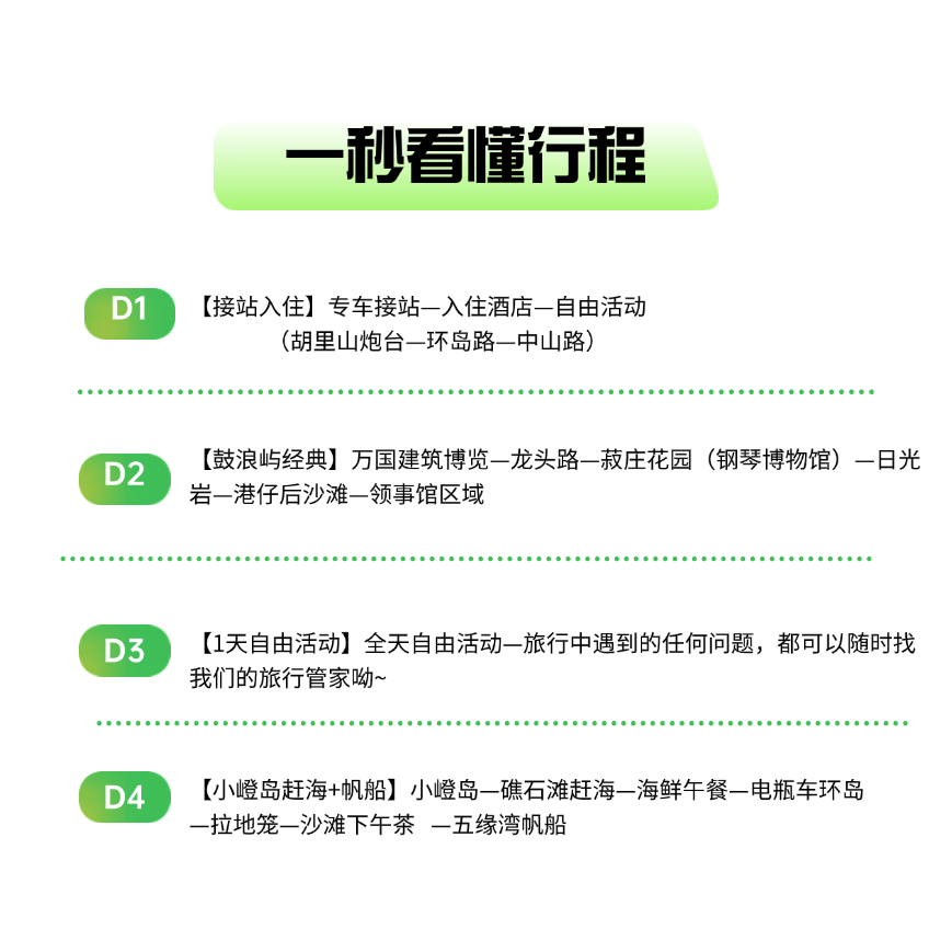专为差旅人群设计的4天3晚行程,覆盖鼓浪屿核心景点、小嶝岛生态体验及帆船出海等多元内容,节奏张弛有度。无需额外请假,利用周末或短假期即可完成一次高质量度假。行程安排避免冗余交通与等待,确保每一分钟都用于真实体验,契合现代差旅者对时间效率的极致追求。