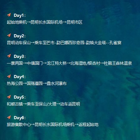 本产品覆盖北京、上海、广州、深圳、成都等22个主要差旅出发城市,提供含往返机票的一站式服务。无论您刚结束一场紧张的商务会议,还是完成跨省项目洽谈,均可无缝衔接6天5晚的云南深度度假。行程涵盖昆明、腾冲、芒市、瑞丽四地,融合自然疗愈与文化体验,让差旅人士在高效工作后迅速切换至放松模式,真正实现‘出差+度假’的完美平衡。