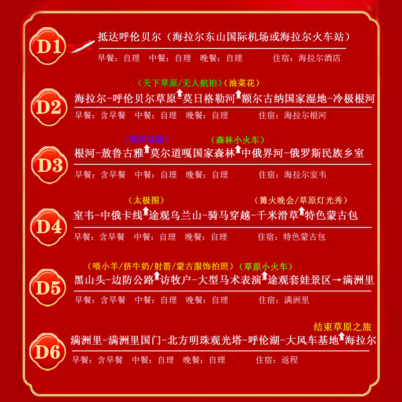 行程涵盖室韦俄罗斯民族乡、满洲里套娃广场等特色文化地标,让您在差旅途中领略中俄蒙三国交界处的独特风貌。漫步百年古村石板路,品尝俄式餐点,选购异域手信,既满足商务社交需求,又丰富个人文化体验,一举两得。