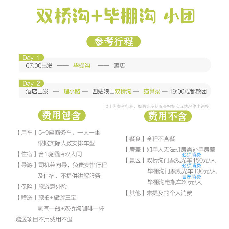 本线路支持1人单独预订,无需拼团等待,特别适合商务人士或独自出差后希望就近放松的旅客。从成都出发,仅需2天时间即可深入川西秘境阿坝州,体验四姑娘山与毕棚沟的壮丽风光。行程安排紧凑合理,兼顾效率与休闲,让差旅之余也能轻松享受高品质度假体验,是高效利用碎片化假期的理想选择。