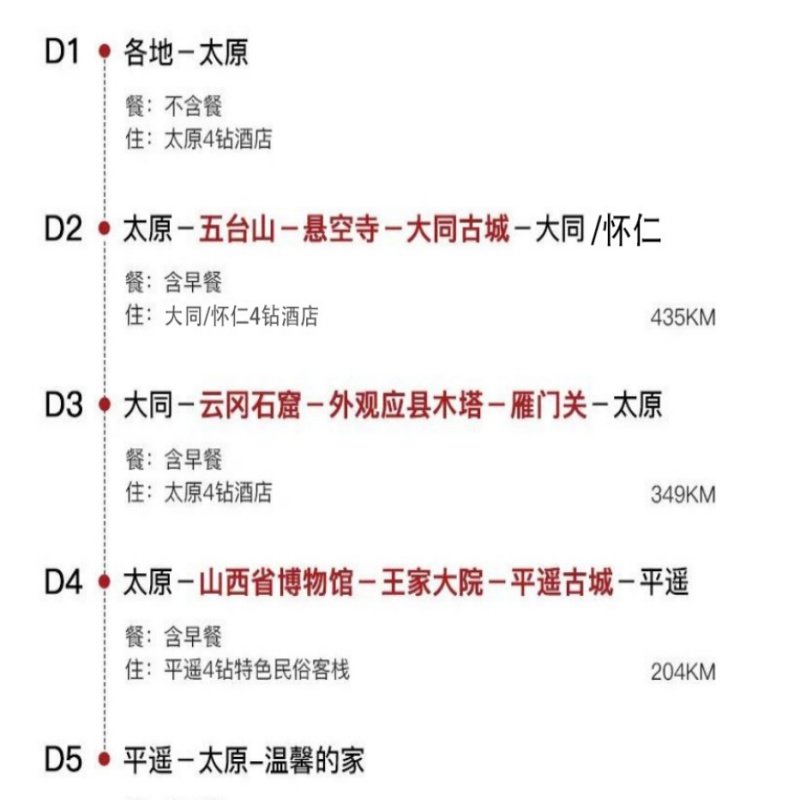5天4晚的行程设计精准契合现代差旅节奏,既避免过短导致走马观花,又防止过长影响工作安排。从抵达太原到返程,每日行程张弛有度,白天深度游览,夜晚舒适休整,确保您在高效完成文化探索的同时,仍能保持充沛精力应对后续工作任务。