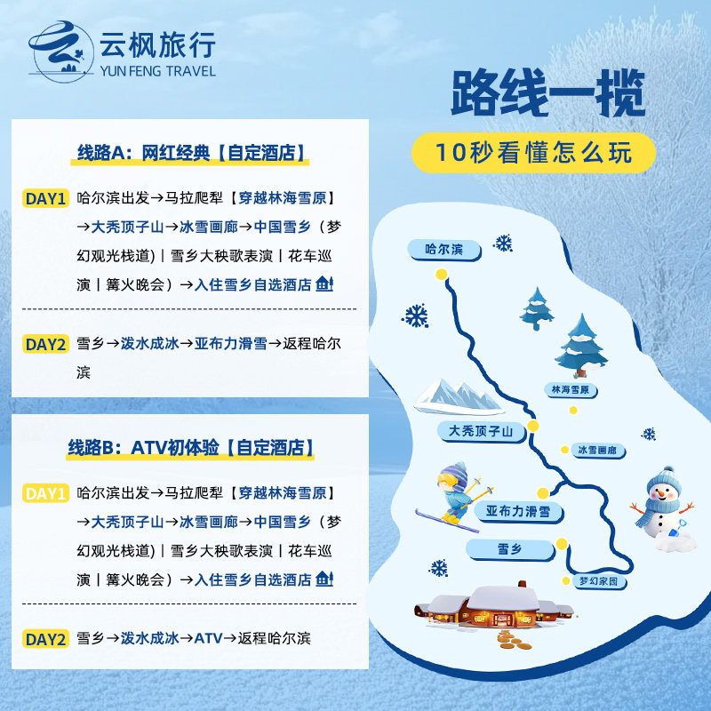 专为时间紧张的差旅人群优化行程结构:第一天下午出发,当晚入住雪乡;次日全天滑雪或体验活动,傍晚返程。全程仅需占用一个完整工作日加两个夜晚,极大降低请假成本。独立包车确保各节点无缝衔接,避免公共交通耗时,真正实现“短假高效玩透冰雪精华”,让差旅休假不再成为负担。