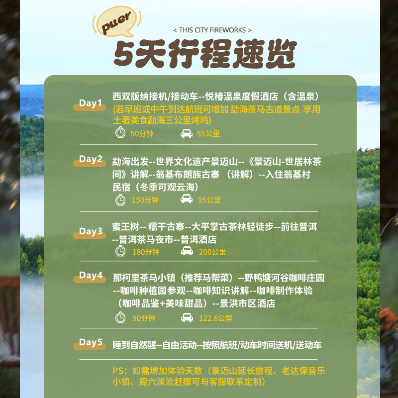 精心规划从西双版纳至普洱景迈山的5天4晚路线,最大化利用有限差旅时间。行程涵盖世界遗产景迈山、热带雨林、温泉度假村及文化村落,交通衔接顺畅,避免无效耗时。无论是周末延伸还是短假出行,都能高效完成一次身心充电,实现‘短途远行’的差旅价值最大化。